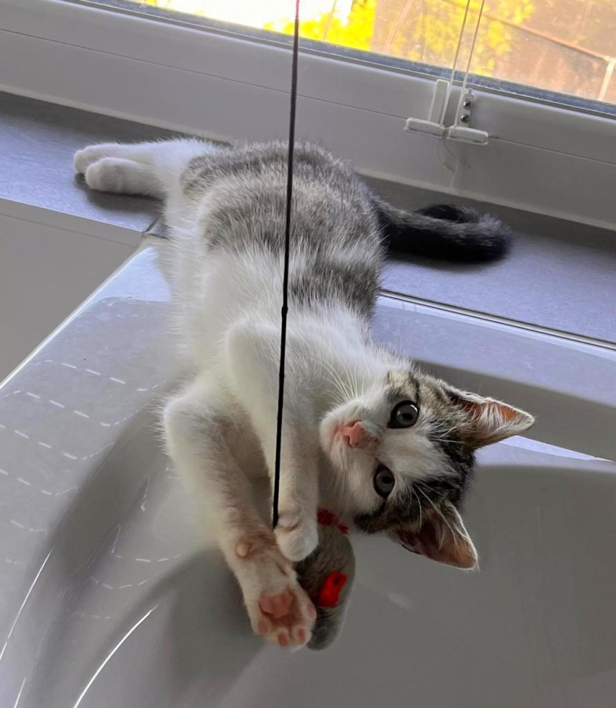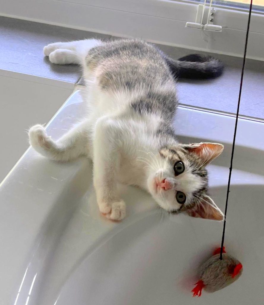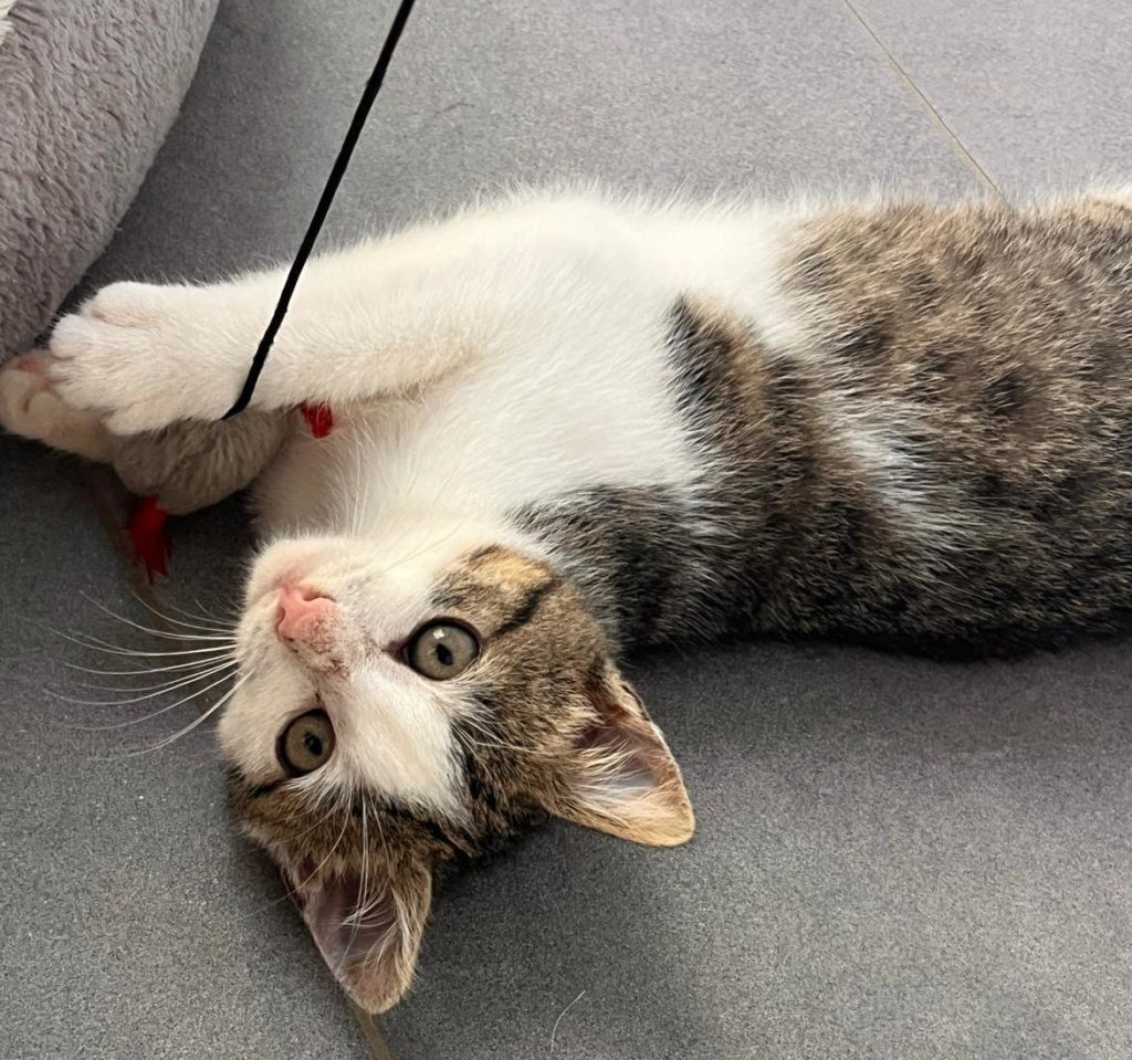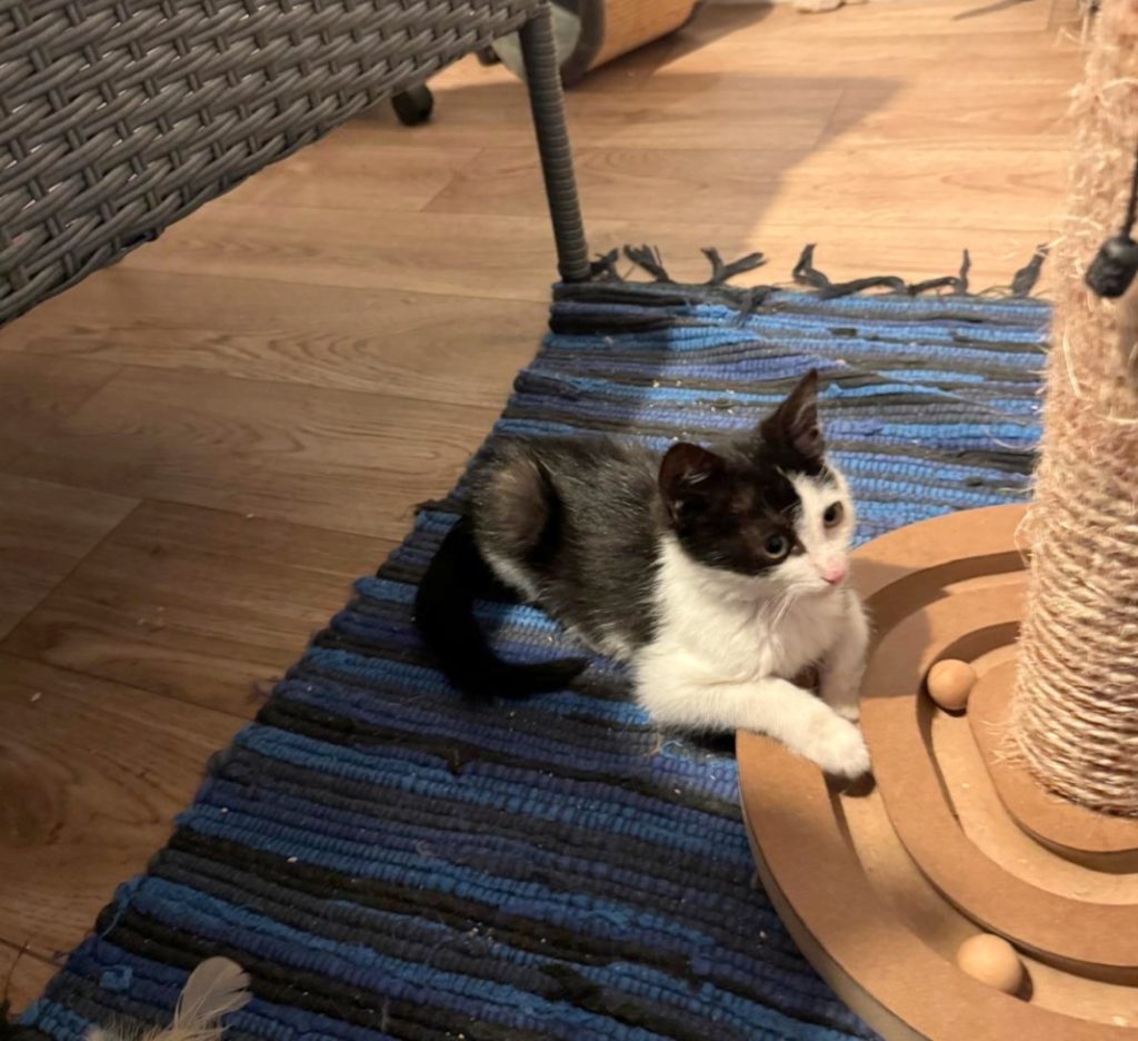 Fin wurde unterkühlt, dehydriert und halb verhungert gefunden. Als er bei unserer Tierärztin abgegeben wurde, war es nicht sicher, ob er überleben würde. Nach ein paar Tagen Intensivpflege besserte sich sein Zustand und er konnte in einer unserer Pflegestellen einziehen, wo er weiterhin aufgepäppelt wird, gute Fortschritte macht und immer munterer wird. Er ist ein liebenswerter kleiner Kater, der dankbar für Zuwendung und Futter ist. Auch mit den anderen Katzenkindern hat er bereits Freundschaft geschlossen. Noch ist er sehr mager und zurückgeblieben, er hatte wohl keinen guten Start ins Leben, doch wenn er weiter an Gewicht zunimmt und wächst, steht einer Vermittlung nichts mehr im Weg.