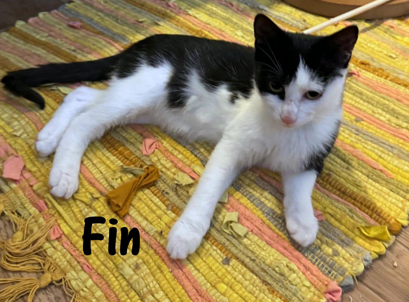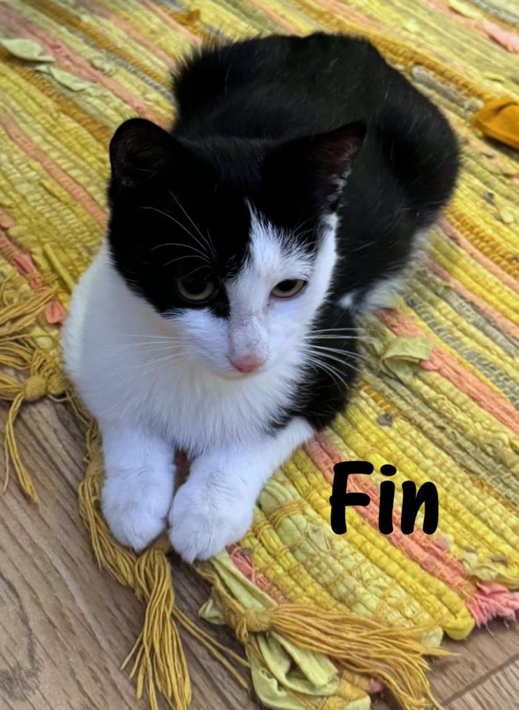 Fin wurde unterkühlt, dehydriert und halb verhungert gefunden. Als er bei unserer Tierärztin abgegeben wurde, war es nicht sicher, ob er überleben würde. Nach ein paar Tagen Intensivpflege besserte sich sein Zustand und er konnte in einer unserer Pflegestellen einziehen, wo er weiterhin aufgepäppelt wird, gute Fortschritte macht und immer munterer wird.  Er ist ein liebenswerter kleiner Kater, der dankbar für Zuwendung und Futter ist. Auch mit den anderen Katzenkindern hat er bereits Freundschaft geschlossen. Noch ist er sehr mager und zurückgeblieben, er hatte wohl keinen guten Start ins Leben, doch wenn er weiter an Gewicht zunimmt und wächst, steht einer Vermittlung nichts mehr im Weg.